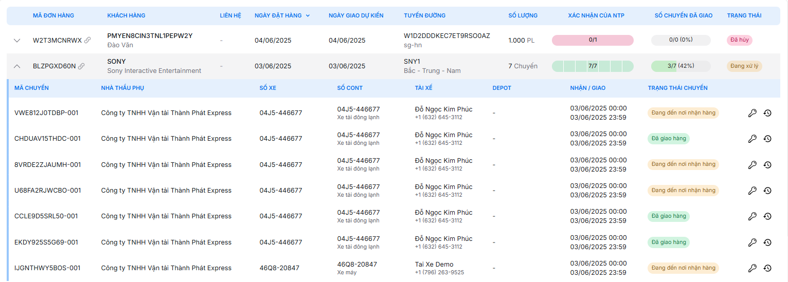 - Sau khi nhấp, một bảng chi tiết các chuyến hàng liên quan đến đơn hàng đó sẽ được mở rộng và hiển thị ngay bên dưới dòng đơn hàng bạn vừa chọn.