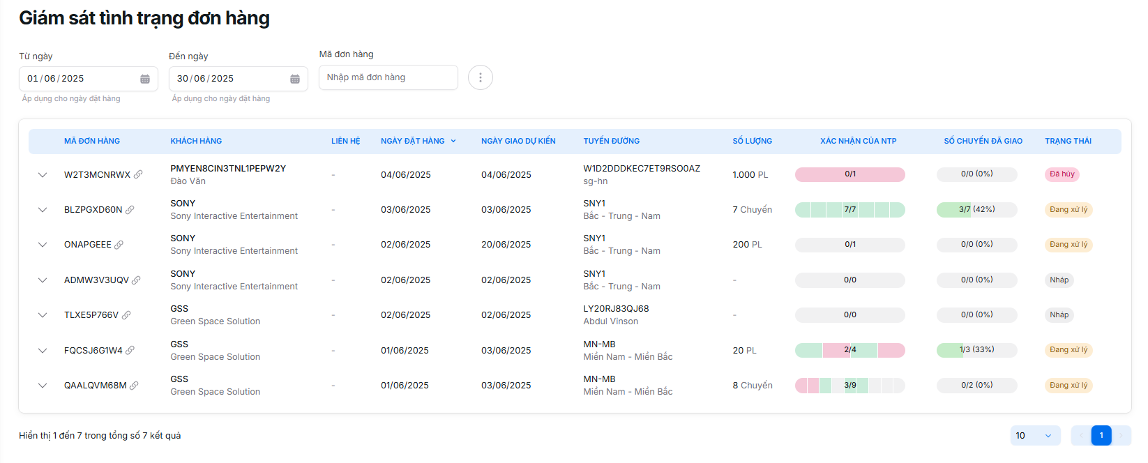 - Trên màn hình Giám sát tình trạng đơn hàng, bạn sẽ thấy danh sách các đơn hàng tổng quan.