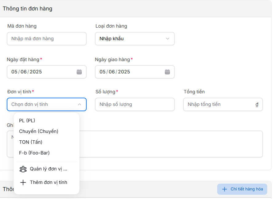 Chọn đơn vị tính và nhập số lượng (nếu chọn chuyến thì không có nhập số lượng).