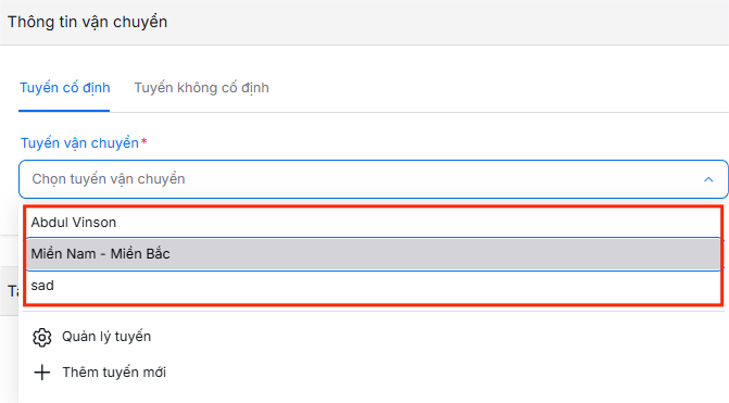 Chọn tuyến vận chuyển có sẵn trong dropdown.