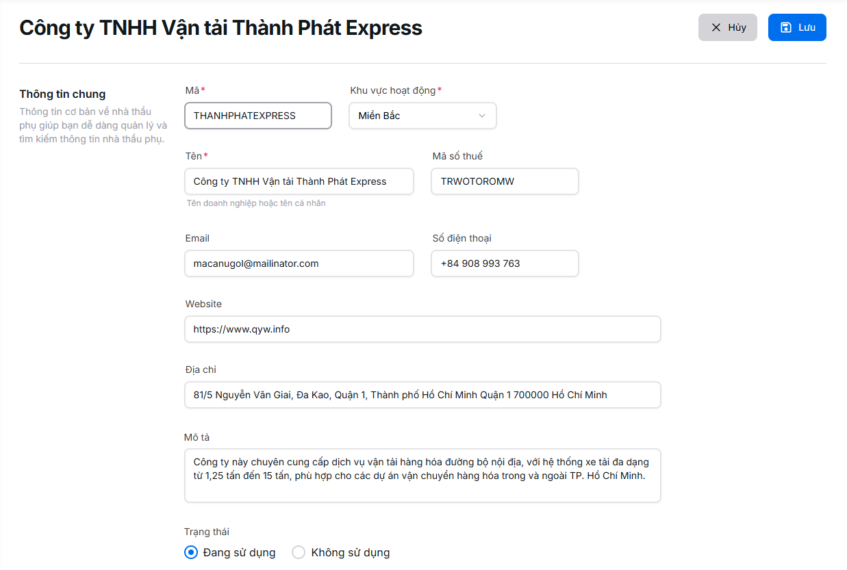 Bước 2: Cập nhật thông tin nhà thầu phụ